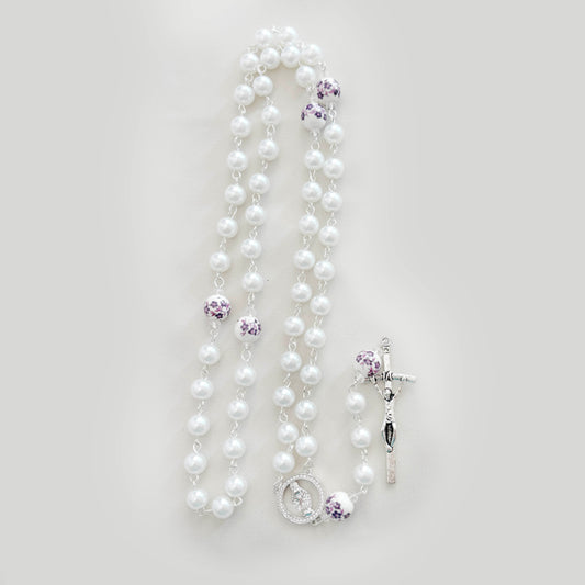 Rosario católico Perlas Blancas - Flor Morada - 1und