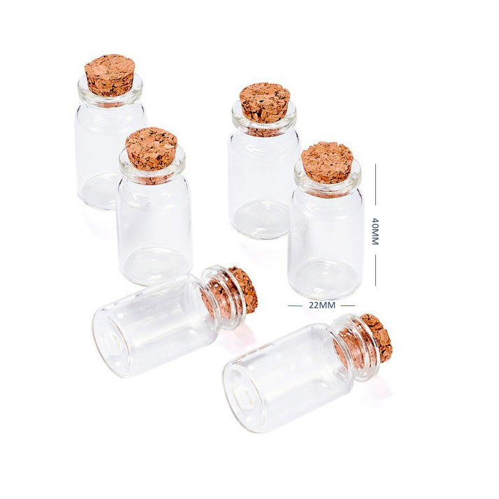 Botellas Pequeñas de vidrio de 22x40mm con tapón de corcho transparente.