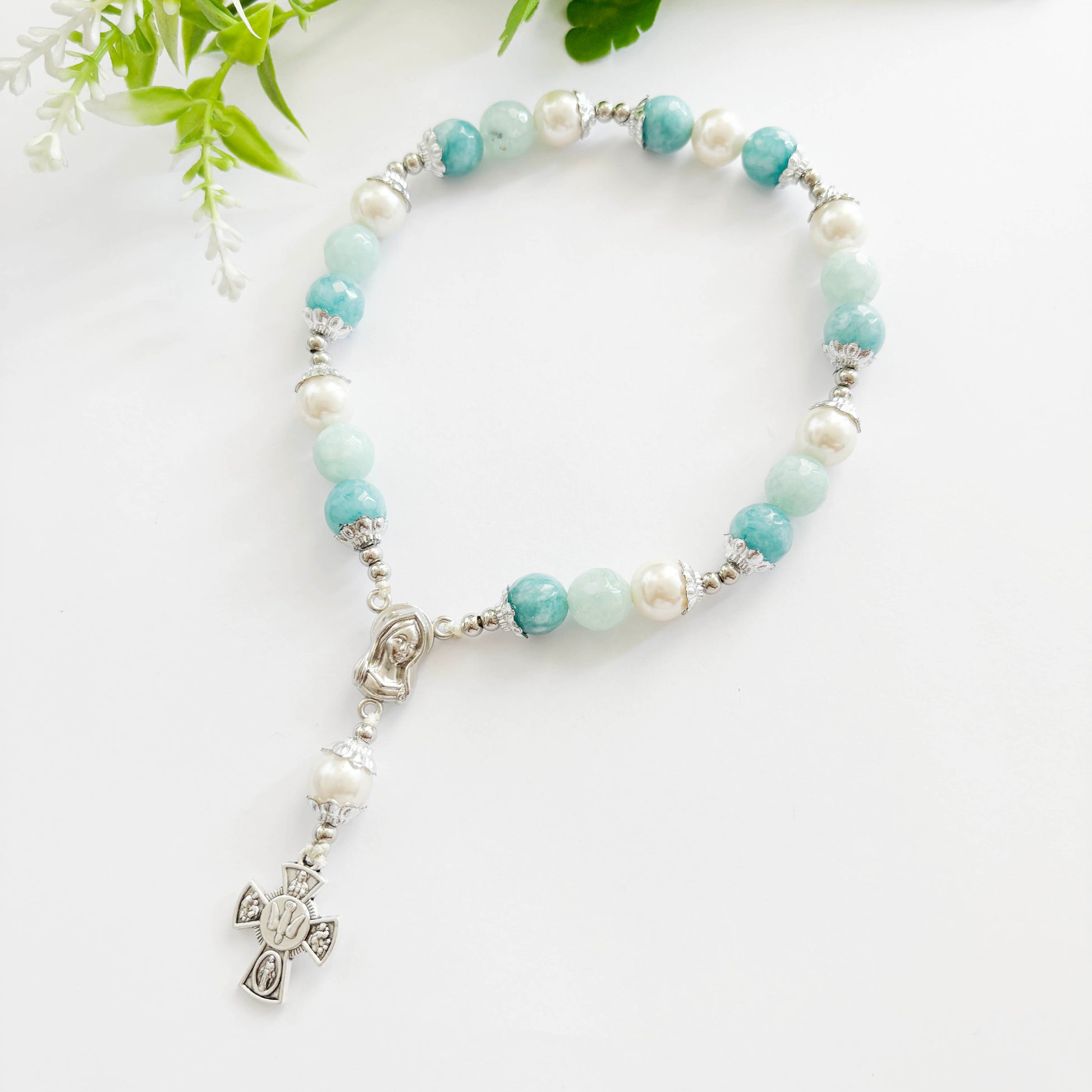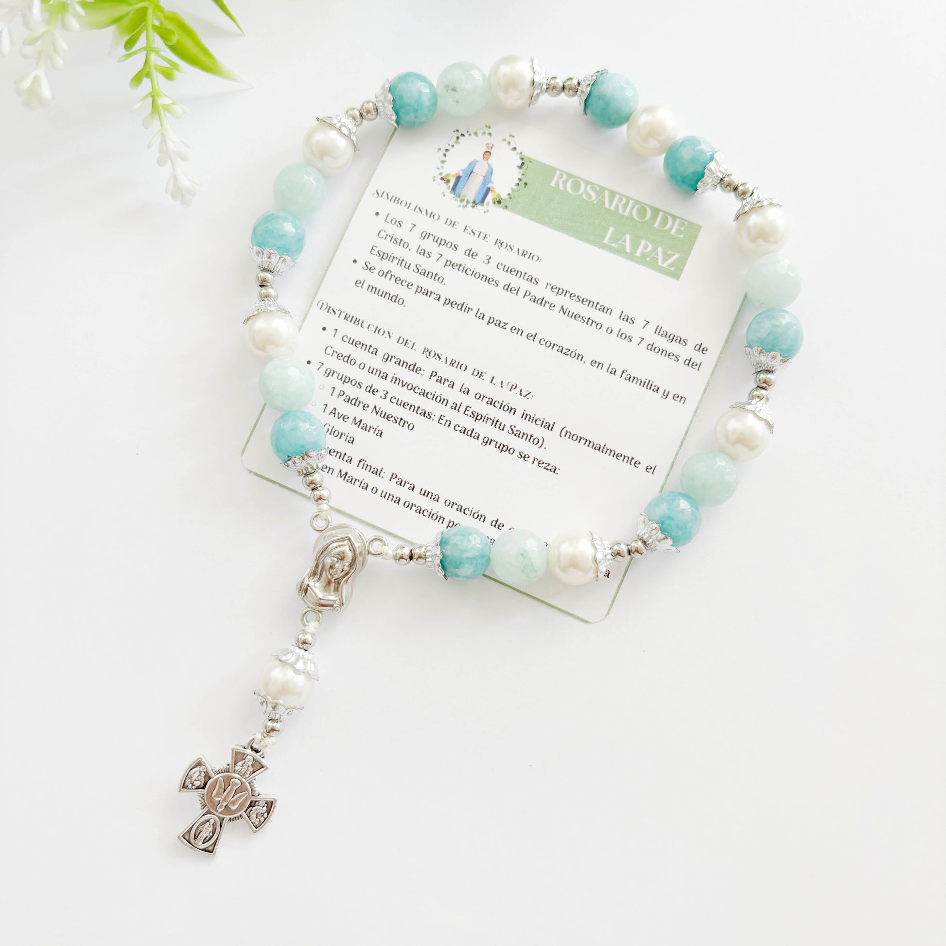 Rosario de la Paz elaborado con piedras de Ágatas En tonos turquesas, verde agua y perlas de 10mm y cruz de la paz, ideal para la recitación devocional de siete Padre Nuestros, Ave Marías y Glorias en honor a las llagas de Cristo y el Espíritu Santo.