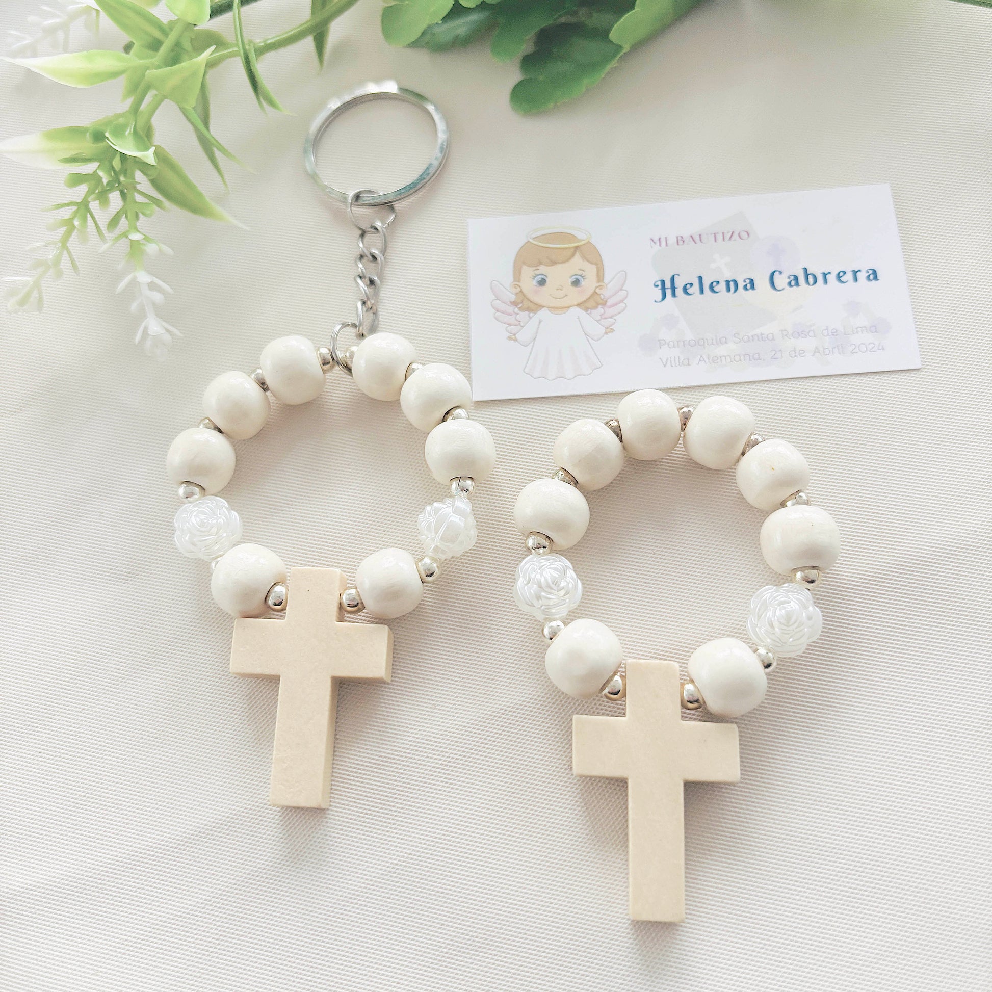 Denarios de madera con dije de cruz en beige y plateado, ideal para recuerdos de bautizos, comuniones, recuerdos luctuosos y misas.