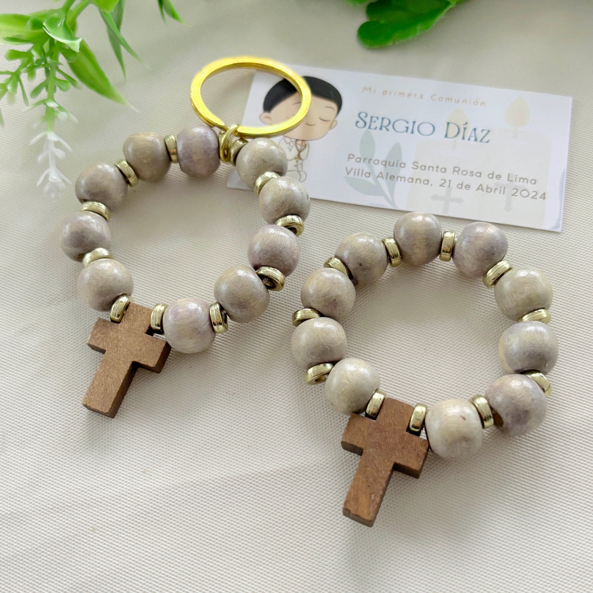 Denario de madera color topo opaco con separadores dorados y cruz café oscuro, ideal para recuerdos de bautizos, comuniones, recuerdos luctuosos y misas.