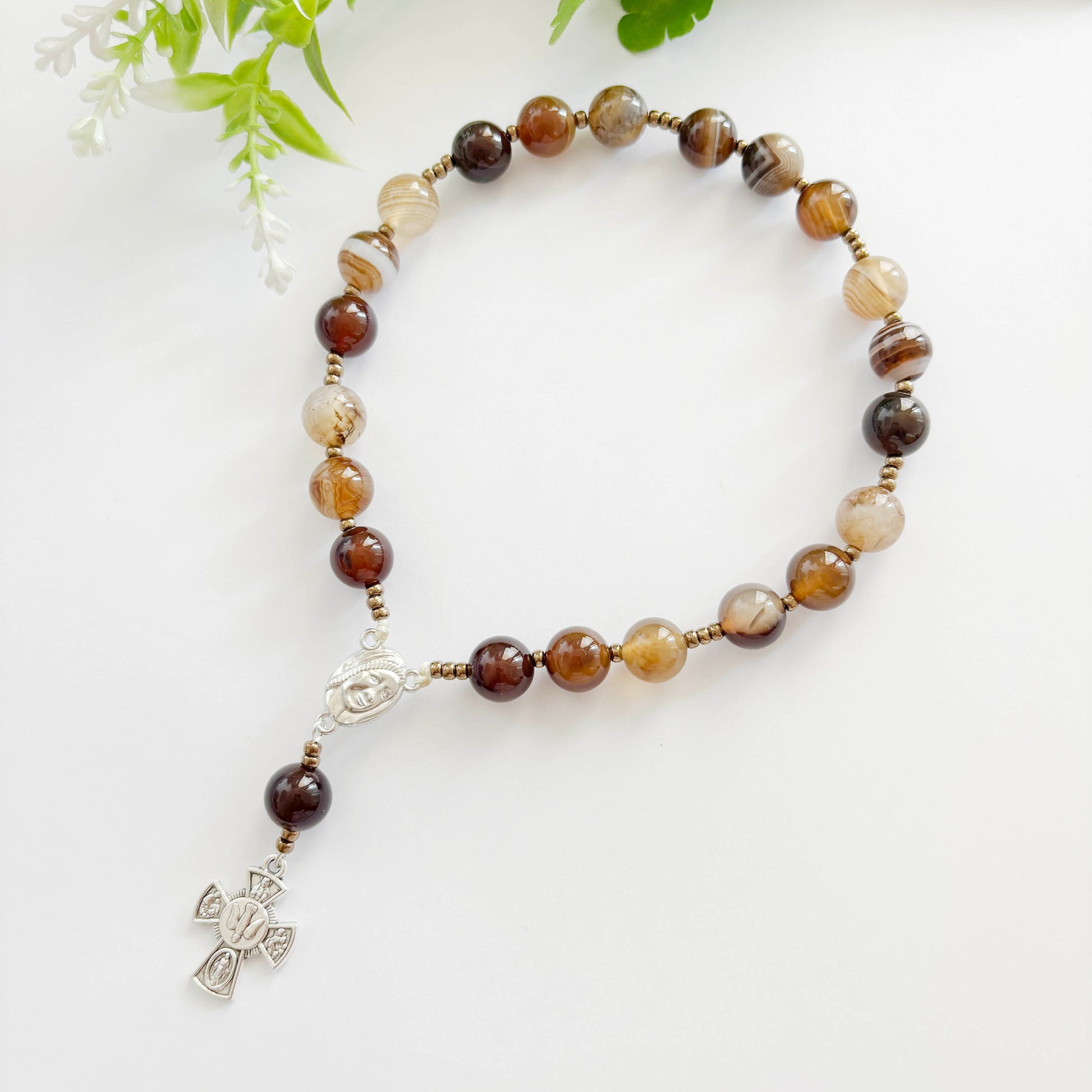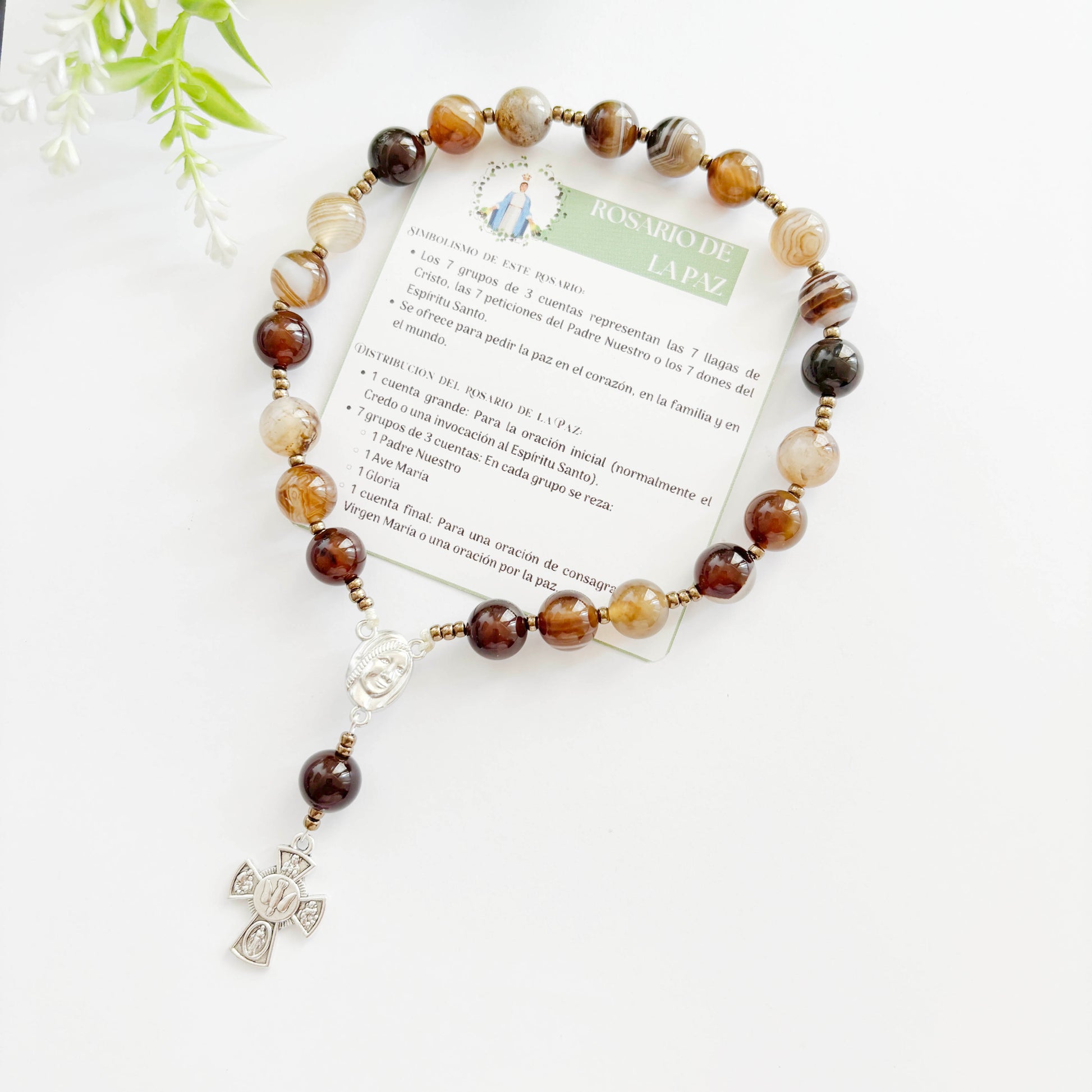 Rosario de la Paz elaborado con piedras de Ágata Café de 10mm y cruz de la paz, ideal para la recitación devocional de siete Padre Nuestros, Ave Marías y Glorias en honor a las llagas de Cristo y el Espíritu Santo.